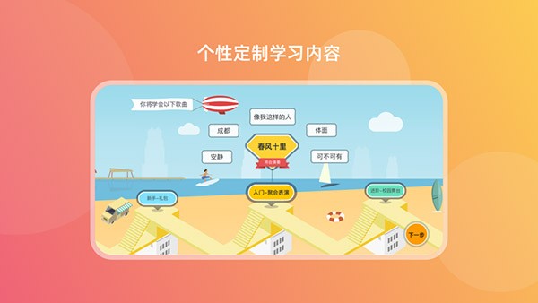 2、App内选中你最想弹奏的那首歌,自动生成0基础的学习路径,挑战音乐游戏,玩着学会N首歌。