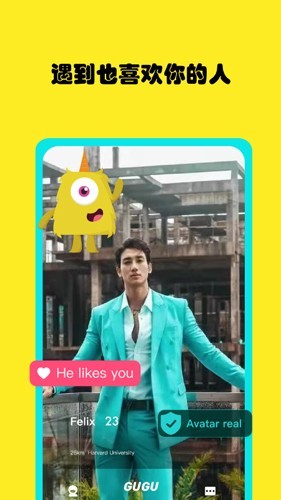 2、【滑片配对】GUGU社交卡片含有三个模式,分别是:恋爱约会、职场交友、文化传播。社交卡片快捷匹配相同爱好的朋友,大数据分类用户。炫酷的特效,简洁实用的界面,GUGU极力打造一款最实用的标签化国际社交软件。