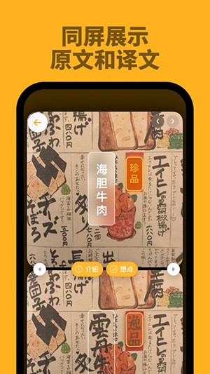 打开后拍照或选择图片即可进行翻译,支持多种语言,翻译页面左下角四个图标分别为双语对比模式、翻译模式、原图模式和文字菜单模式,点击任一框框即可使用「介绍」功能获得详细解析,加入「想点」后即可在右下角「想点」中完成点餐。
