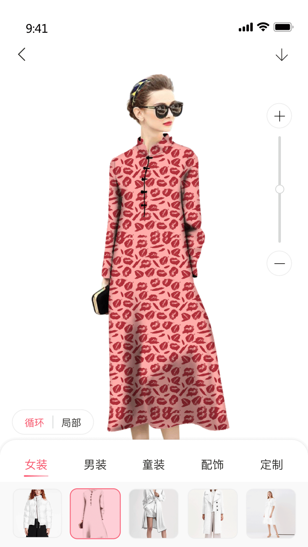 可以手指拖动调节花型位置,也可以按“+”与“-”调整花型大小!让虚拟样衣呈现最佳效果!