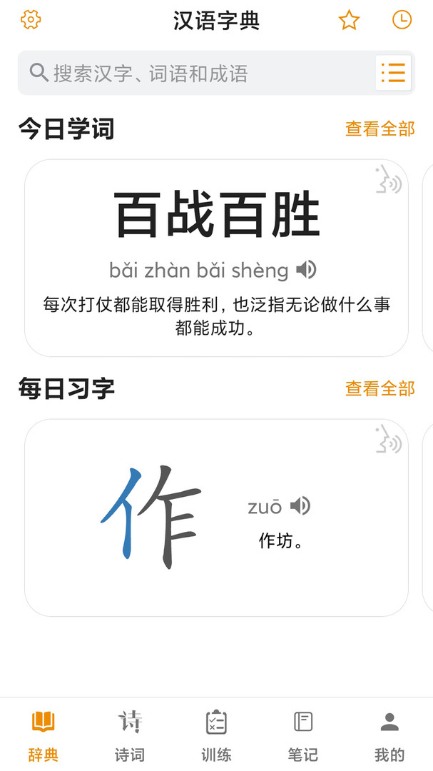 汉语字典app是由长沙合伙人信息技术有限公司所打造的手机端学习汉语的软件,该软件内收录的汉语汉字是非常丰富的,在这里你可以认识学习到非常多的汉字,支持关键词搜索,会有非常详细的释义帮助大家更好的去了解其来源、并帮助记忆,学习起来事半功倍!有需要的小伙伴们快来下载试试吧!