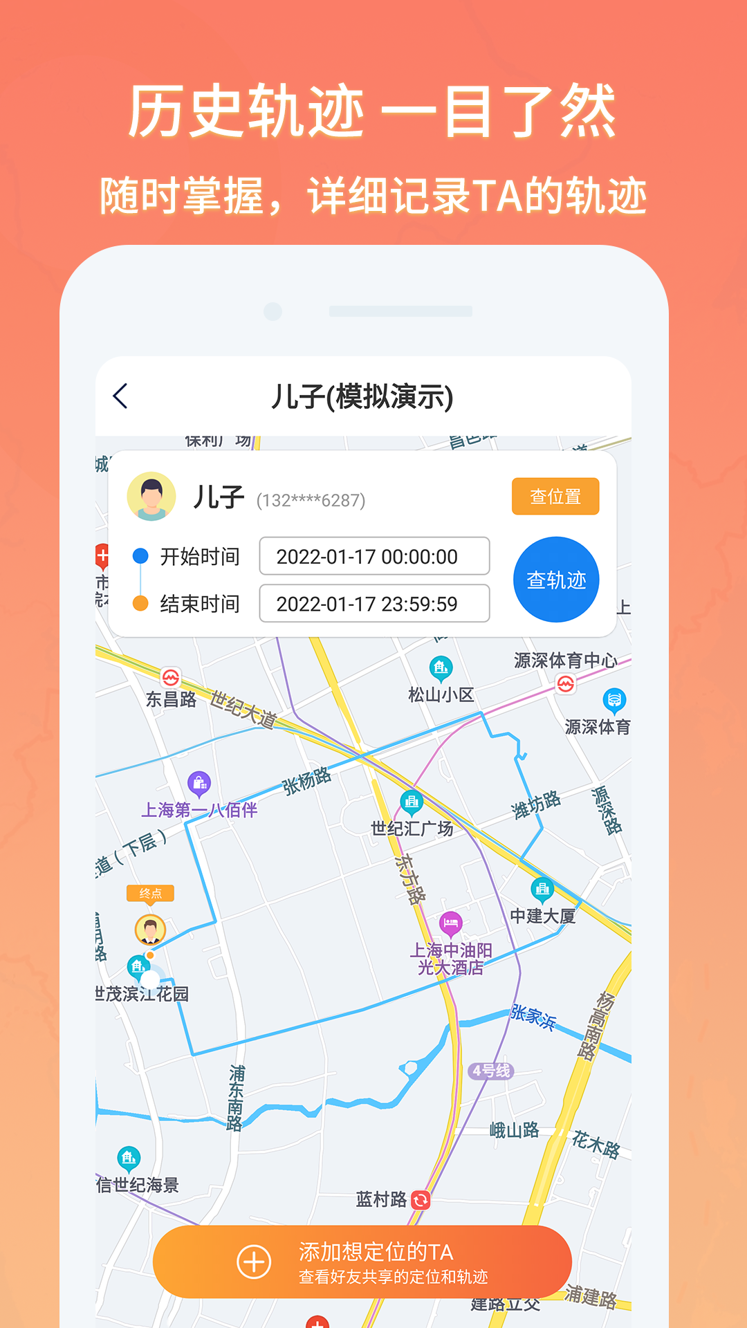 1、通过手机定位共享守护好友的安全定位软件,您可以通过该软件查找共享好友的位置定位及历史轨迹等信息;