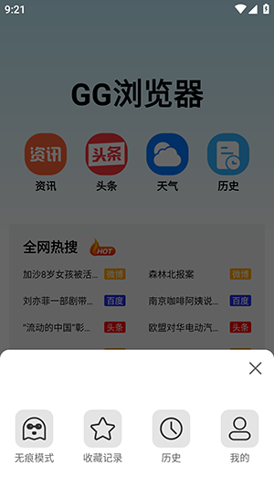 GG浏览器软件是一款能了解最新实事资讯的优质软件,其中的搜索网站多样且强大,如百度、每日头条等等,都能展示出和问题比较相似的答案,这样也能减少你的筛选时间,日常大家的浏览和操作历史都能保存下来,这样无论是任何时间都可以返回继续观看,不仅如此,这里还有无痕的浏览模式,可以保障每个小伙伴当前使用的安全,避免出现数据的泄露,日常对于搜索方面比较感兴趣的用户可以来尝试一下!