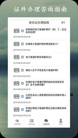该软件还为广大用户提供了多个证件相关咨询问题,你可以随时随地进行咨询;