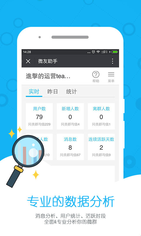 支持实时搜集群数据,统计每日人员变动、活跃和潜水用户,分析聊天内容提取关键词、活跃时段分析,将群活跃度与同类群对比分析、群数据批量导出等数据分析功能。