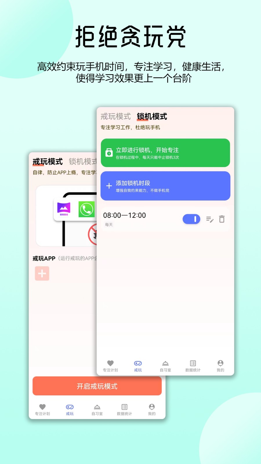 2、戒玩锁机模式: 可以帮助用户阻止继续玩手机,有效避免分心影响学习或工作。