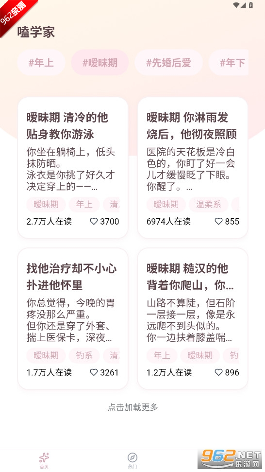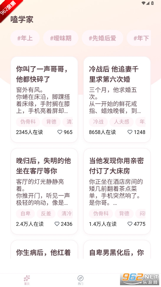 《嗑学家app》是一款免费乙女向短篇小说阅读创作平台,汇集海量高甜、反转、治愈的梦女小说,提供便捷的创作工具、个性化推荐和丰富的社区互动,让用户沉浸式体验,与同好分享创作,随时随地享受磕糖乐趣,满足少女心幻想。