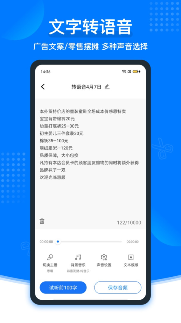 支持文本转音频,可手动输入文字,也可以直接从模板库中导入文本,设置不同风格的声音和背景合成语音文件