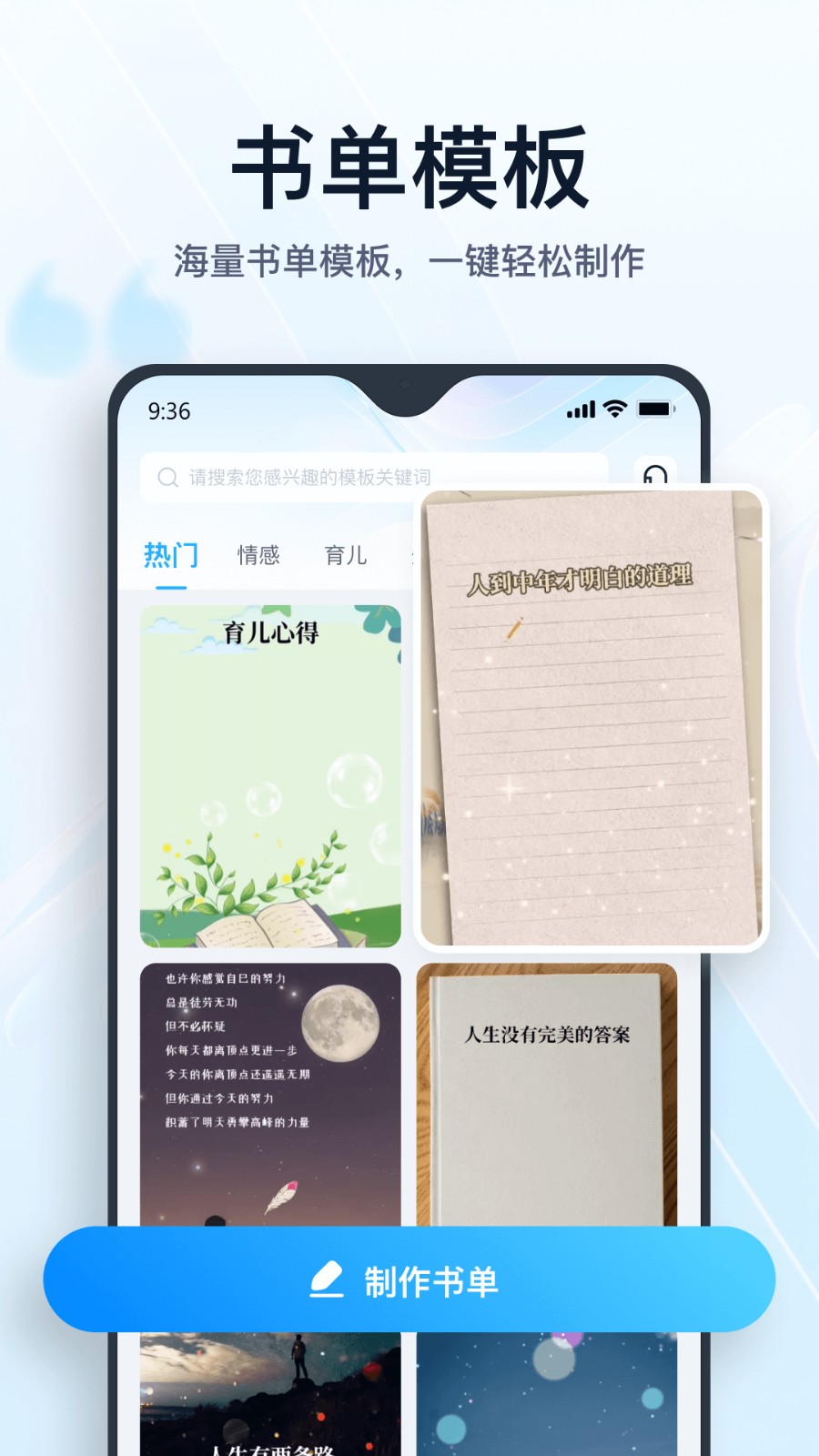 书单制作家是一款可以制作书单的多功能手机应用工具,可以支持单制作、视频处理、图片处理、提词器等服务,操作简单流畅,用户可以根据自己的喜好选择不同的模版进行制作,平台收录了超多美化工具,可以自由添加不同效果的滤镜,贴纸和文字等,全部工具都是可以免费使用的,还能够支持自定义设置专属于你的个性照片墙和动漫头像,为你精心设计不同的主题形象。