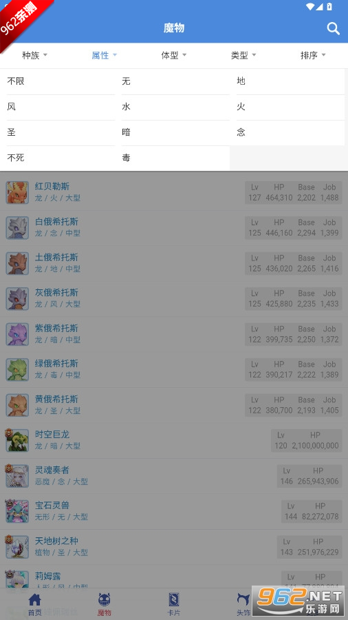 1、打开仙境初心百科app可以看到许多游戏资料,如:魔物、宠物、卡片、头饰以及装备等等。