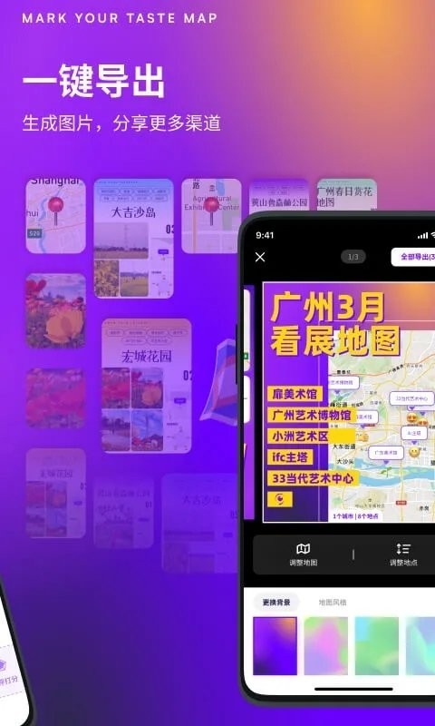 无需频繁切换拼图软件,支持批量导出各种主题的地图封面以及分享海报