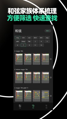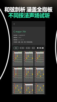 3、内置数十种常用和弦,随时随地的练习和演奏乐曲,让您轻松学习吉他弹奏技能,完成吉他自学,