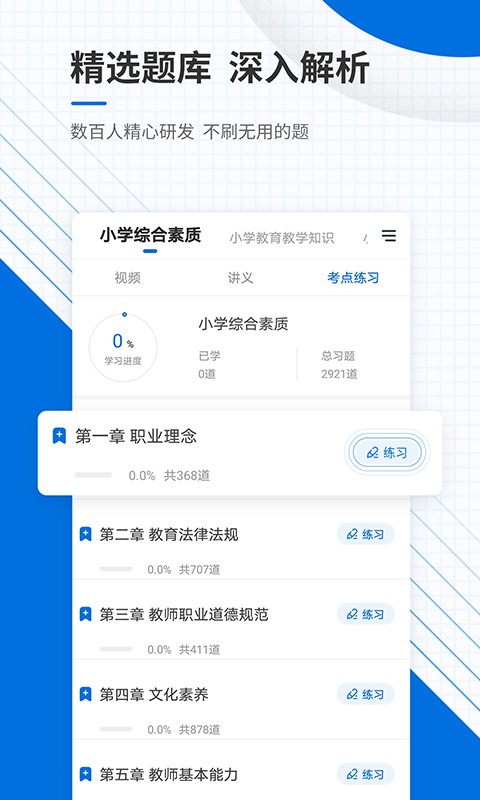 教师资格准题库是一款专门为正在准备教师资格证考试的学生们设计的职业备考软件,平台及时为广大考生整理了各类高频考点和重要知识题库,通过章节训练和海量刷题辅助,来帮助你掌握考试重点,巩固学习基础,各类学习资料和历代真题资源在这里都可以免费浏览,官方教材和考试资讯同步更新,实时为你推送最新题型解析和考试重点测试,提高你的应试能力。
