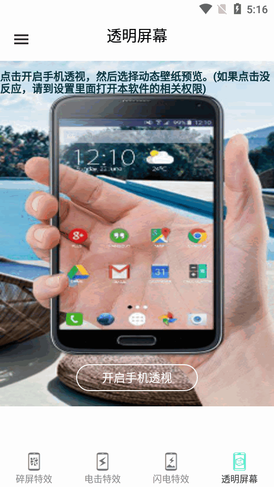 2、碎屏特效:开启应用,设置碎屏特效。用手指触碰屏幕时听见”砰“的一声,屏幕玻璃”碎裂“了。