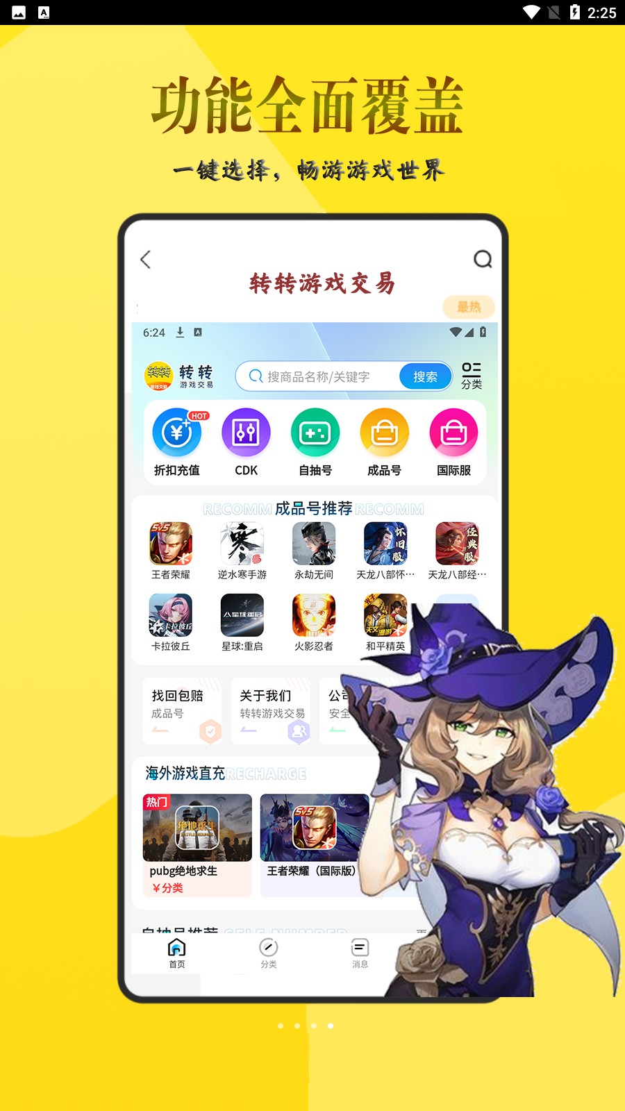 转转游戏交易是一款深受广大游戏玩家们欢迎的游戏账号交易平台,涵盖王者荣耀,和平精英,蛋仔派对,星穹铁道等多种网络热门游戏,账号类型丰富多样,给你不一样的选择,不仅可以随时了解各类账号详细信息,还可以在线进行游戏充值,购买任何你需要的道具,一键下单,同步到账不会有任何延迟,官方会严格审核每一笔交易,让你可以放心筛选自己喜欢的游戏账号。