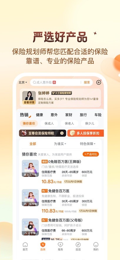 车险、意外险、健康险、财产险、养老理财,一应俱全,随心选购。