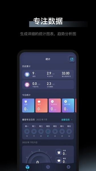 在您需要全身心投入的时候,协助您不碰手机,当开启该功能,1FocusApp会记录您不碰手机的时长,并汇总进每日统计。