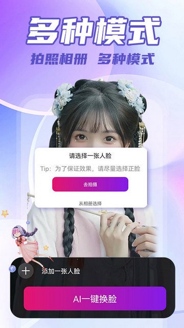 AI视频换脸秀APP是一款功能非常强大的图片换脸软件,拥有强大的AI算法,为你提供超易上手的编辑功用和超乎想象的编辑效果,可以让你梦回古代,云裳羽衣,只需一张照片,穿越感受华夏衣冠之美!唯美古风汉服,做个古装视频分享进来,马上让你的社交圈繁华起来,取得点赞无数,喜欢的朋友快来下载体验吧!