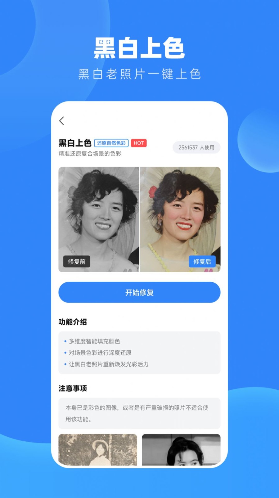 2、提供了多种实用的修复工具,包括恢复色彩、去除瑕疵、调整光暗等,可以对过往的珍贵照片进行快速修复;