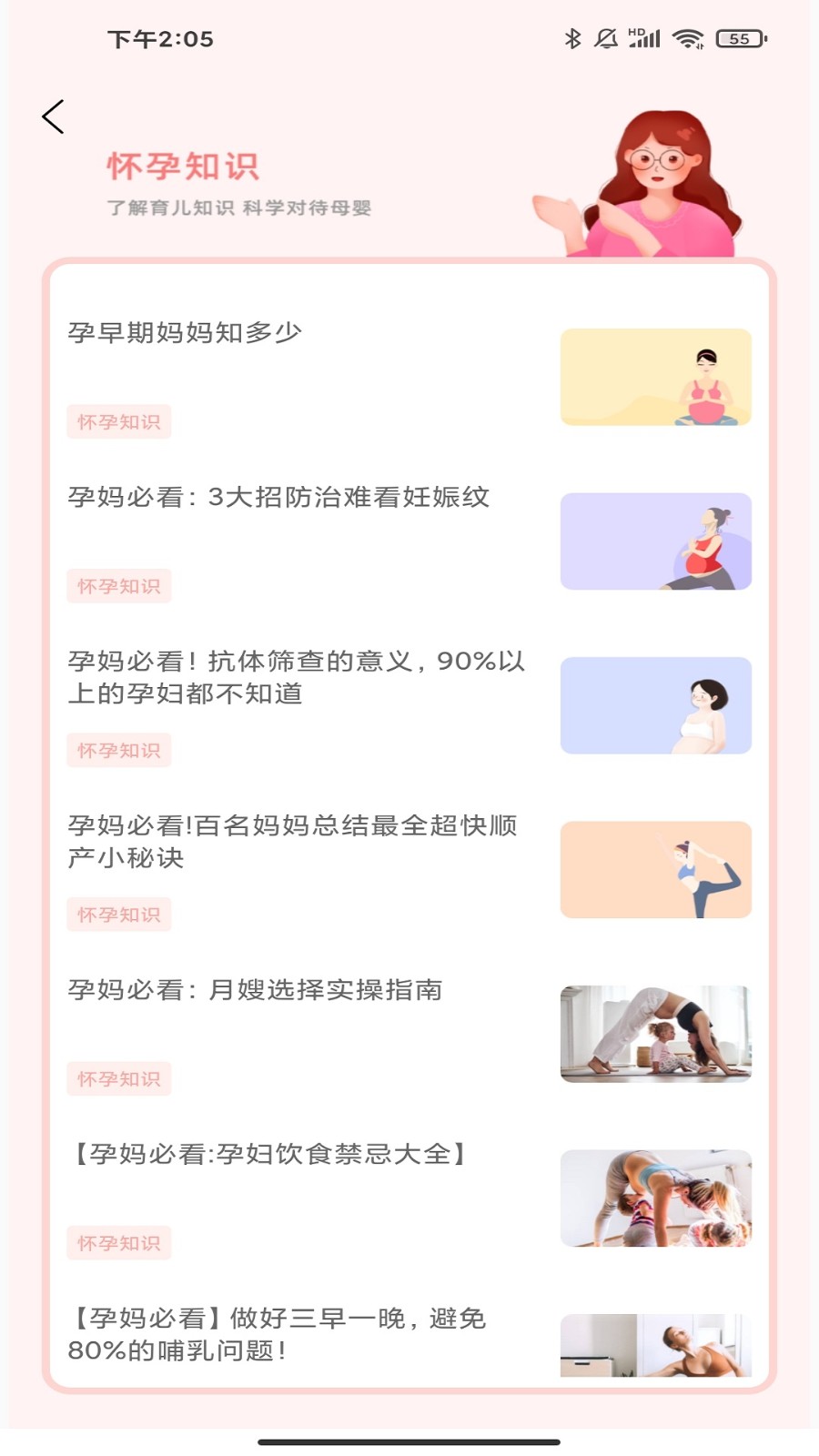 2、还提供了很多与孕妇健康相关的内容,例如孕期常见疾病、注意事项、腰痛预防、孕期运动等等;