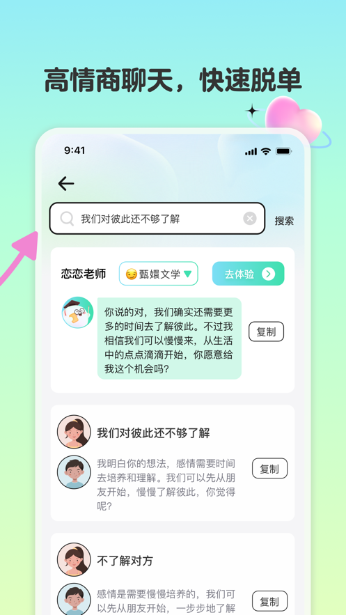 恋相遇软件是一款聊天话术约会辅助软件,同步更新各种不同的聊天话术内容,让我们面对各类社交场景都不会怯场,聊天对象不同,我们所需要的话题也是不一样的,可以试着在线模拟体验看看,全方位提升你的沟通实力,就算面对喜欢的人,也能勇敢去交流。喜欢的朋友快来下载体验吧!