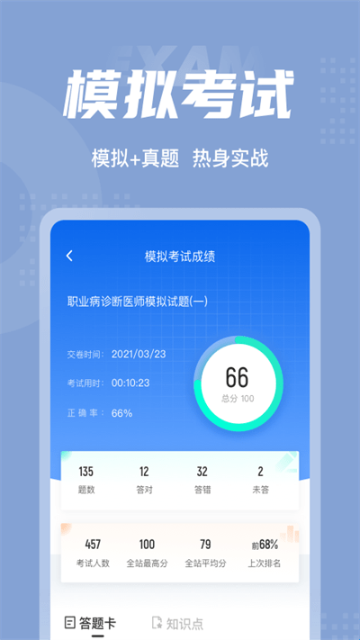 4、模拟考试功能,职业病诊断医师可按照自我练习的考点选择相对应的模拟试卷,也可选择搭配好的模拟整卷考试。