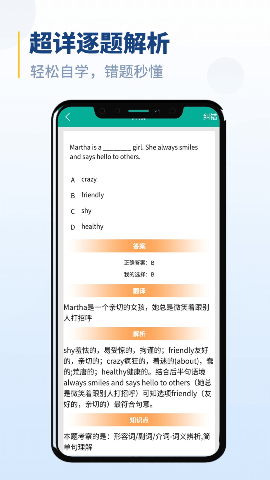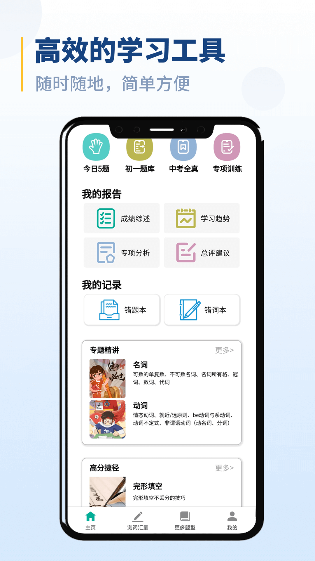 这是一款初中语法学习APP,主要是有题库/做题/详解/订正等模块,它不仅能测词汇量、刷题,还会收集分析各种做题细节数据,利用大数据、云计算、AI智能技术,深度挖掘症结,客观地提出结果报告,更快速有效地帮助用户提高成绩。