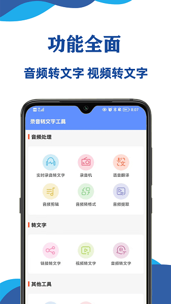 录音转文字助手带有录音转文字、文字转语音、视频转文字、视频转音频、文字翻译、图片文字识别功能,满足多种场景下的文字语音处理需求。