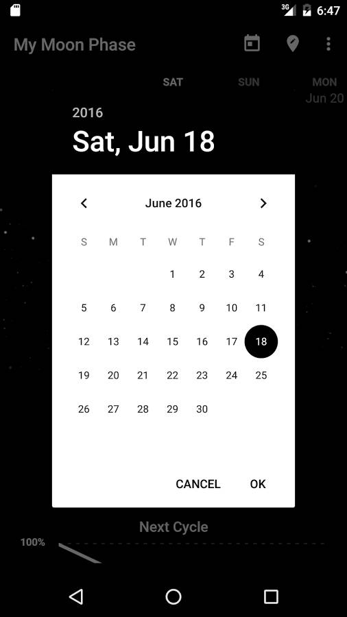 4.查看任意日期间完整的月相轮回情况,只需滚动日期条或者点击日历按钮!