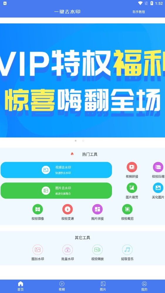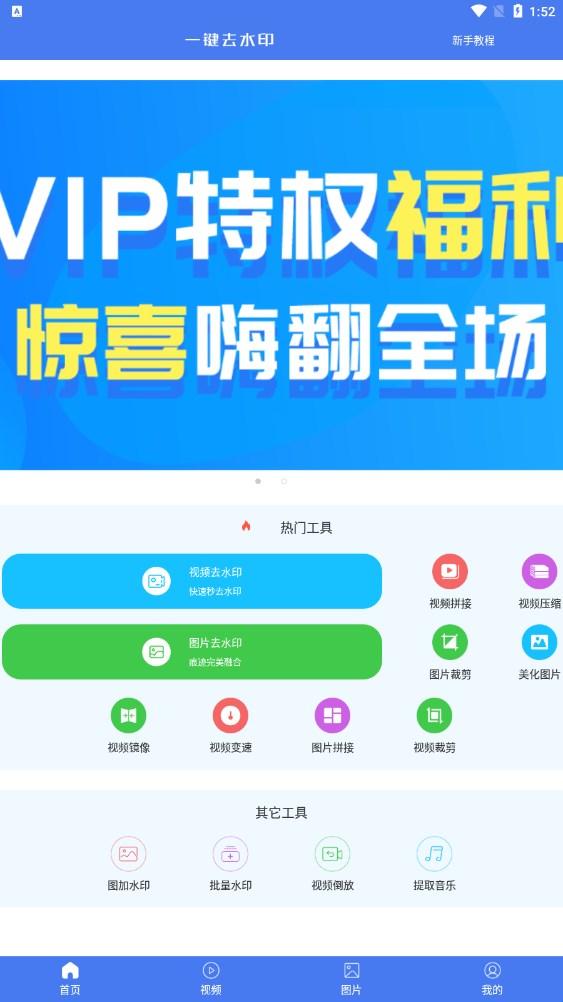 一键去除水印软件是一款长沙君如意网络科技有限公司所打造的一键去水印的app,该软件内所提供的工具是非常齐全的,包括视频去水印、图片去水印、视频拼接、视频镜像、图片拼接等,可以很好的满足广大用户需求,实用性是非常高的,有需要的小伙伴们快来下载试试吧!