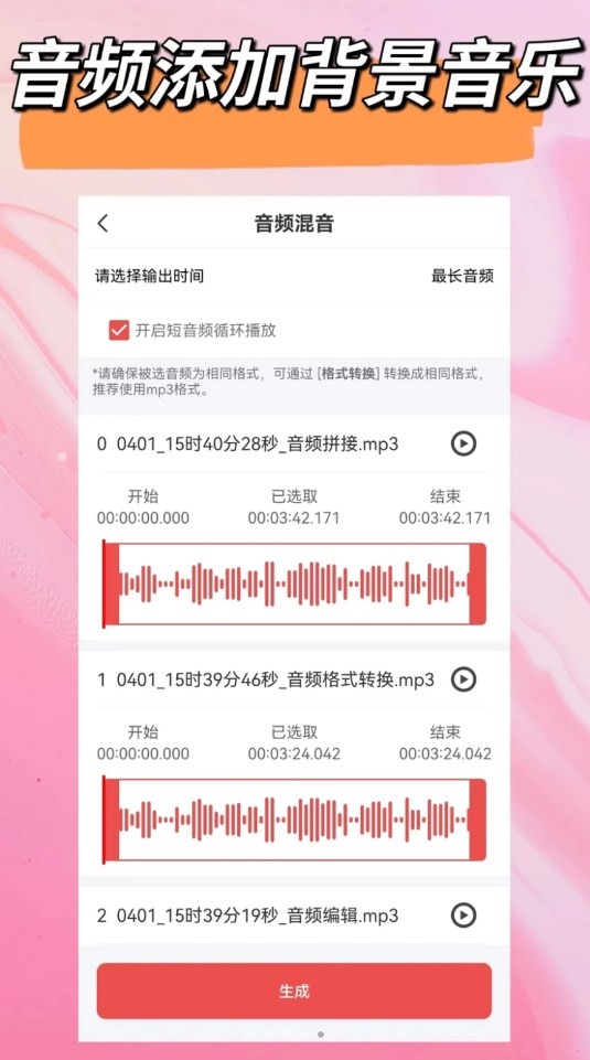 3、将不同的音乐混合成一首音乐,可调节音乐音量,设置音乐出现时间。