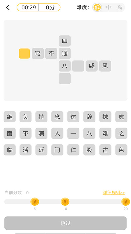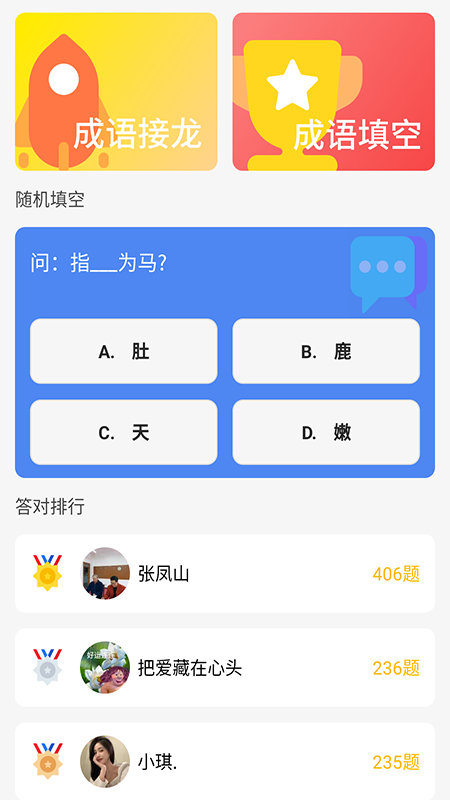 2、【成语接龙赚钱】 每题4个成语,完成首尾填空,可获得金币奖励