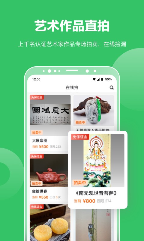 4、在线拍:国画,邮票,紫砂,茶叶,高品质翡翠,书法大师书法字帖真迹,世界名画等应有尽有,线上直拍,竞价捡漏。