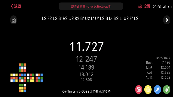 2、硬件计时器:配合智能计时器,使用蓝牙通信,APP上实时显示计时结果并保存。提供专业魔方打乱公式、丰富的统计图表和求解等功能。