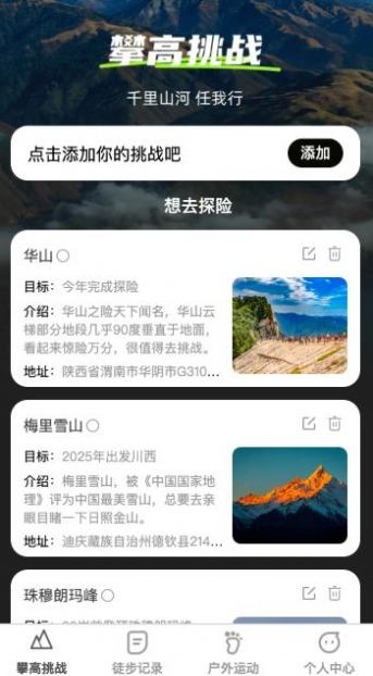 3、你能够在这款软件上面记录你攀登祖国高山的心得与经验,记录你的辉煌时刻。