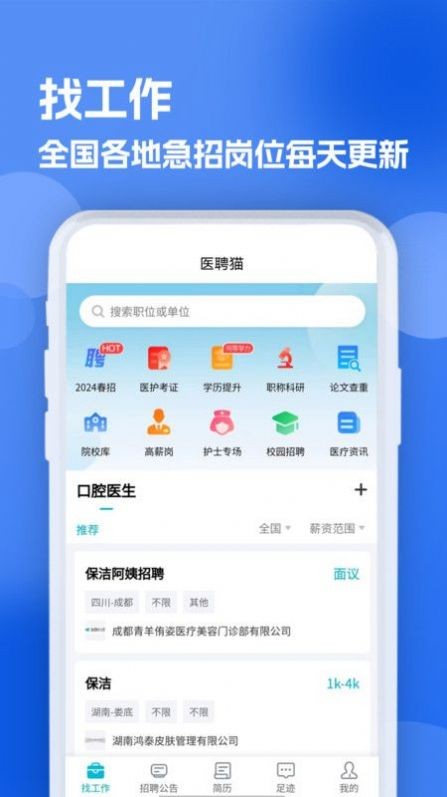 口腔招聘求职网是一款专门为医疗从业人员设计的招聘软件,界面简洁大方,各个功能板块分类详细,用户可以直接在线上浏览中意的职位信息,海量人才和优质职位汇集在此,平台岗位信息实时更新,感兴趣的小伙伴们快来下载试试吧!