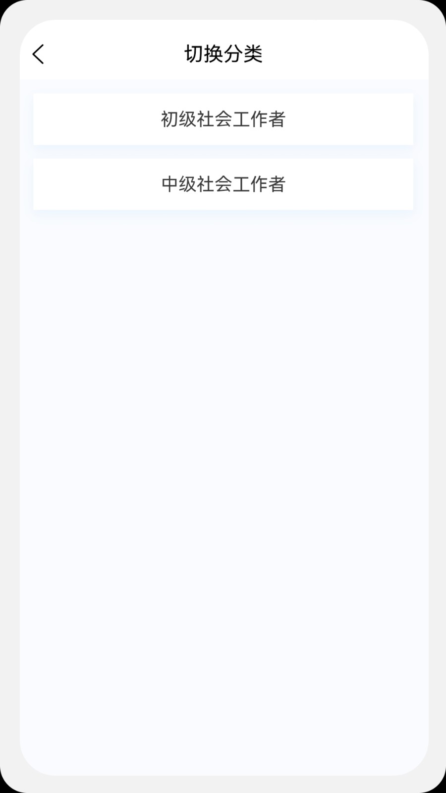 2、切换分类:支持将中级社会工作者的考试题库切换到初级社会工作者的考试题库类型中。