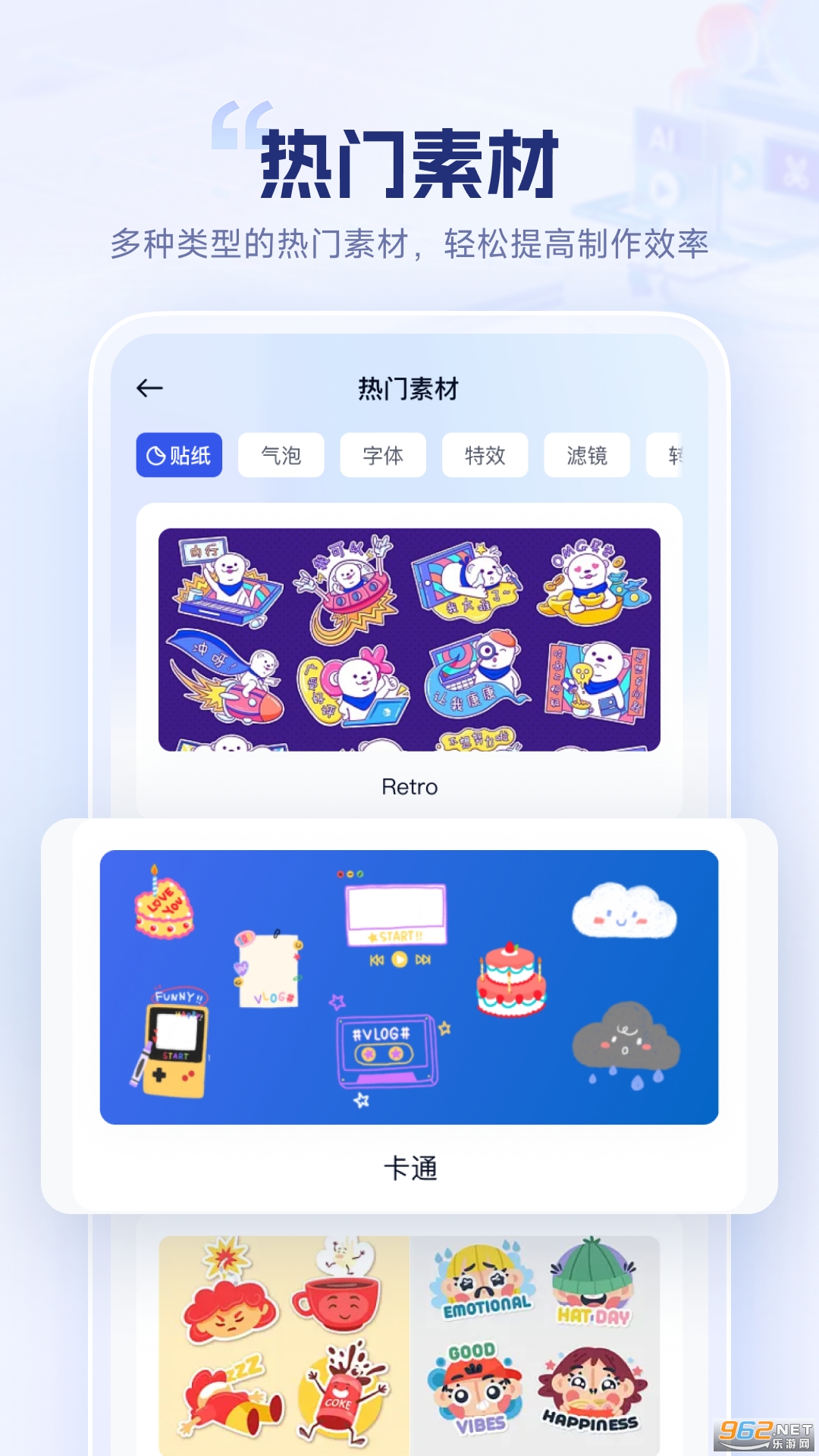 AI创意工具矩阵:集成视频变漫画、照片动起来、智能抠像、动态追踪等12项AI功能,如“照片3D化”可自动生成立体场景,“语音转字幕”支持方言识别,降低技术门槛。
