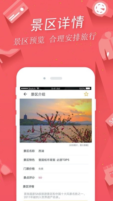 这是一个专门为旅游爱好者打造的免费旅游出行APP。旅游用户选择某个城市之后,该城市所有的景点会在地图上标记给用户。包含景点的门票信息、详细地址、人文历史等。掌上景点支持按城市维度搜索,支持全国407个地级市的景点数据查询。挑选您的目标城市,切换之后,该城市内的所有景区,我们在地图上都给您标记出来,方便安排您的出行。