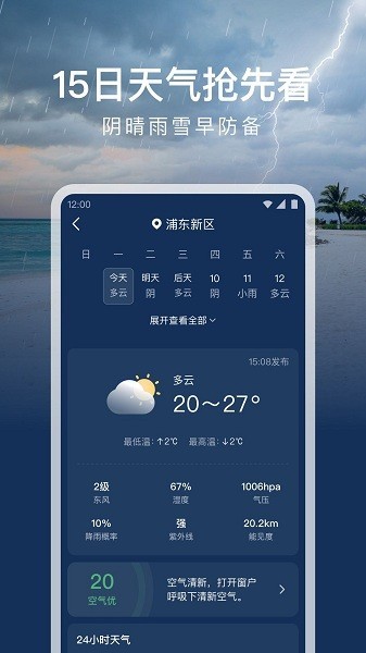 全方位覆盖空气质量预报,显示15日空气质量趋势,以及是否适合户外活动,PM2、5、PM10空气污染物清晰展示,防"霾"于未然