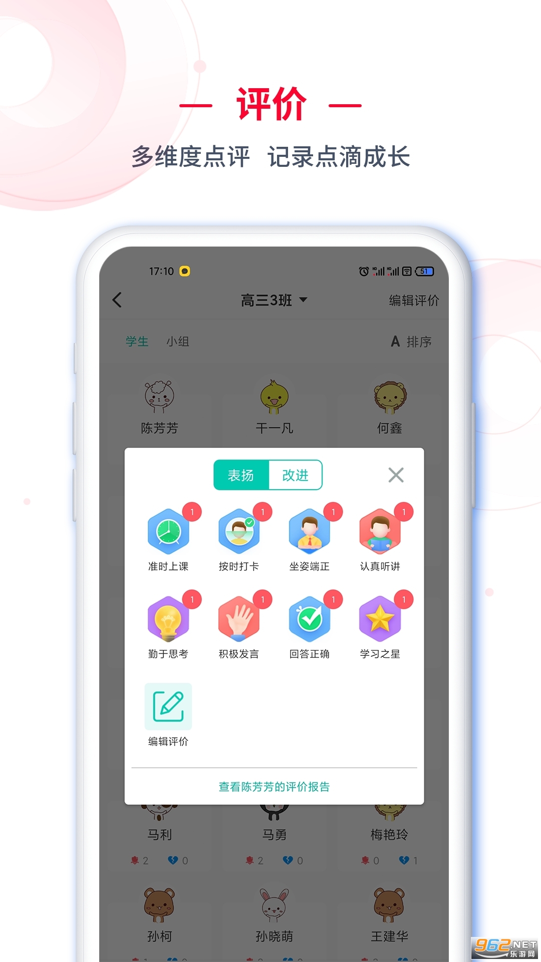 1、【教学评价】:多维度动态点评学生,实时查看成长记录;