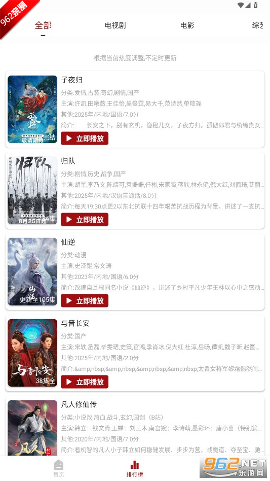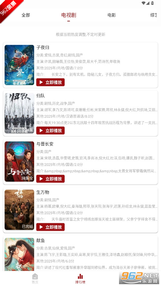 2、“排行榜”根据全网线上平台及电视卫视播放,来推送近期以来热播的剧目。