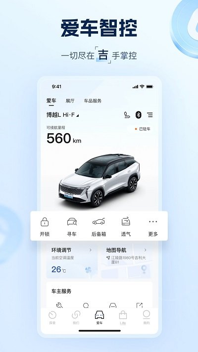 吉利汽车app官方版是一款主打吉利官方推出的吉利汽车app远程控制软件。通过软件可以掌握吉利汽车的最新官方动态,还可以连接你的爱车了解状态信息,通过软件进行手机操控,丰富的功能给你带来智慧驾驶生活,赶快来下载试试吧!