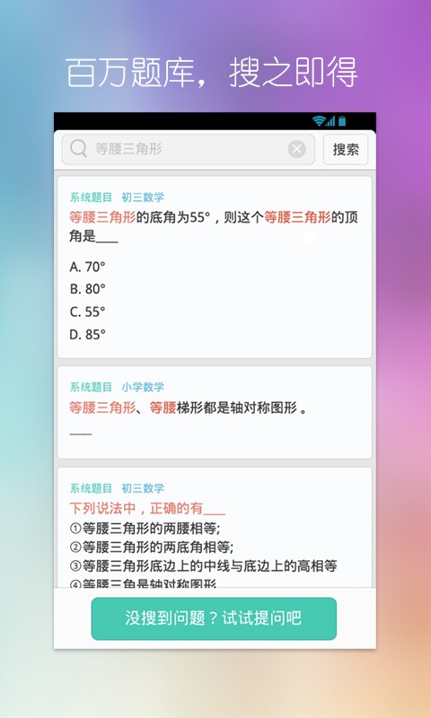 2、题库搜索:作业帮手,好比雪中送炭。问他作业的学习题库涵盖小学到高中每科目90%课后习题,作业答案搜索即得;