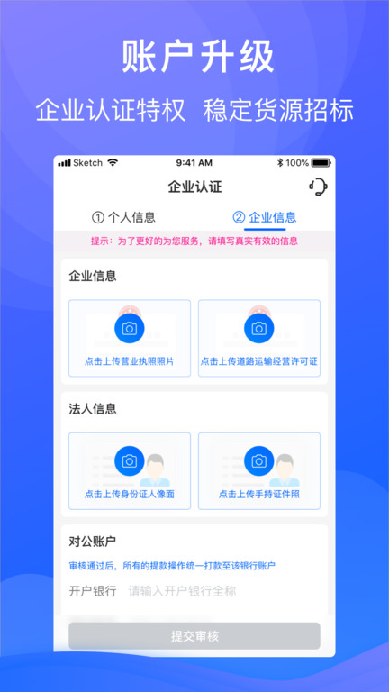 3.账户管理升级,为企业提供认证特权,提供更加稳定的货源招标;