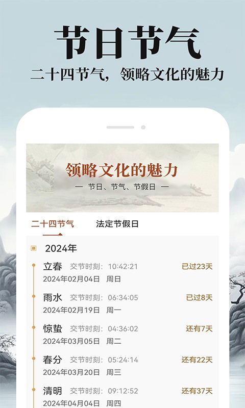 1、这里还有节气等日期查询功能,结合了传统习俗内容介绍,让我们了解到每一个节气对应的文化习俗有哪些,轻松掌握知识。