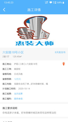 惠装大师app是一款以装修为主的线上服务平台,方面了装修者与需要装修者之间的沟通,能够在该软件上清晰看到地址,房子面积,设计风格等等相关信息,是一款装修房子的必备工具。