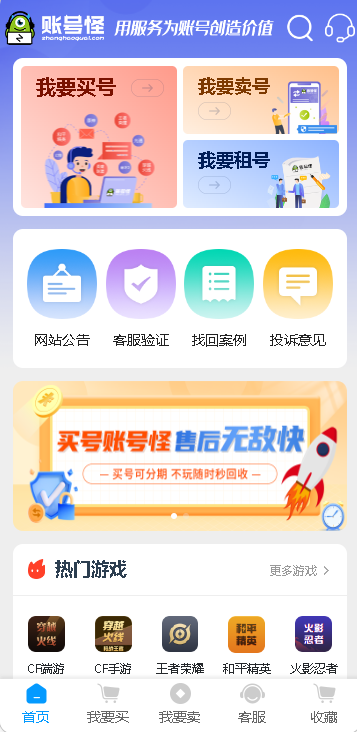 账号怪是一款可以自由交易游戏账号的手机应用软件,涵盖网络各大热门经典游戏账号,类型丰富,可以满足不同玩家的使用需求,平台会为广大玩家提供最新游戏资讯和攻略,让你可以随时了解自己喜欢的游戏官方动态,官方账号信息真实可靠,玩家们可以放心购买。