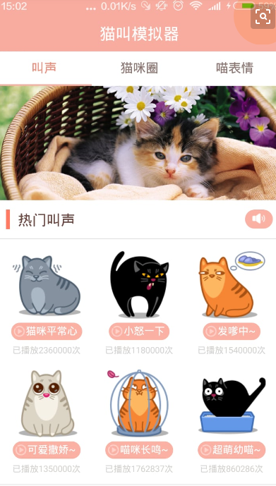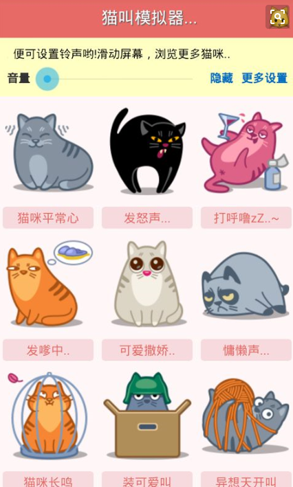 猫叫模拟器是一款看名字就明白的软件,这款软件可以模拟非常的多猫叫声,分为不同品种不同种类不同性别不同感情,用来逗猫真是十分容易,小猫咪说不定被忽悠的一愣一愣的!