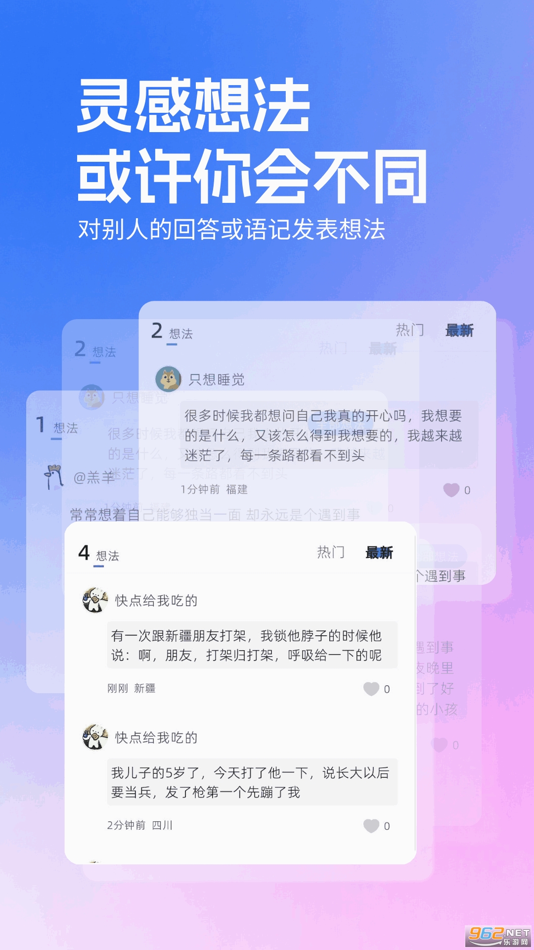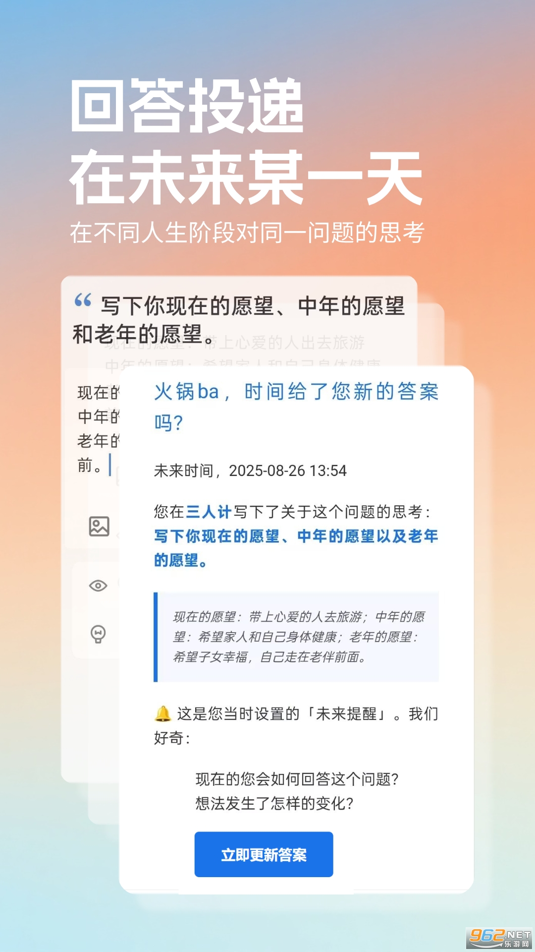 每日问答回溯:随机或自选问题引导用户记录当下感受,系统一年后自动推送历史回答,通过时间维度对比直观展现思维变化轨迹,促进深度自我反思。